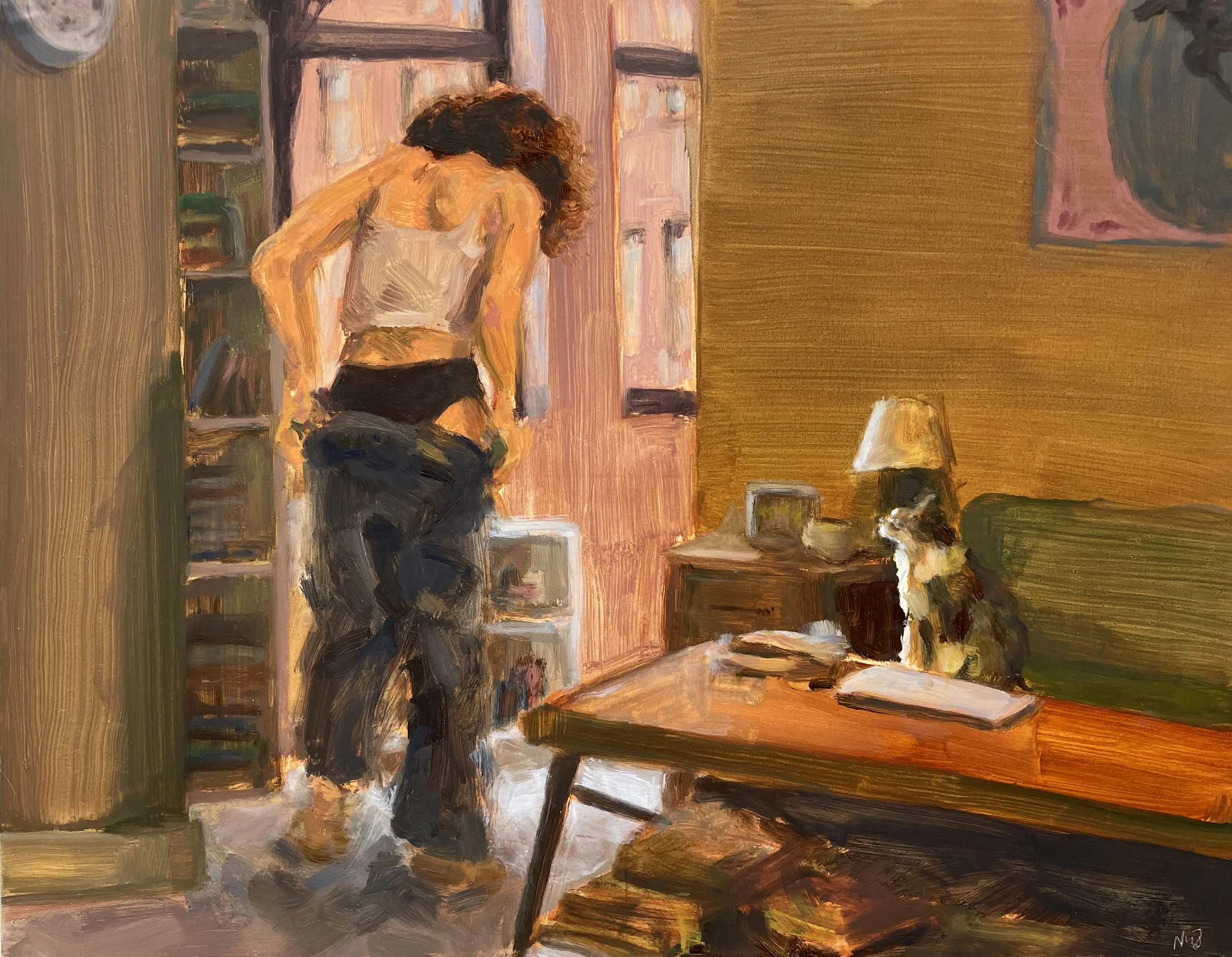 Each piece of mine is a study: a study of how physical paint looks, feels, and acts in relationship to the ground and to itself; a study of my memories, emotions, and childhood; a study of nostalgia. Painting is a way for me to incorporate my interest in the intimacy of day to day life into my love of paint and color. I take inspiration from people, places, and things that I encounter in my everyday life through their narrative and emotion. I want my audience to feel like they've been transported either emotionally or physically into the scenery of my images.