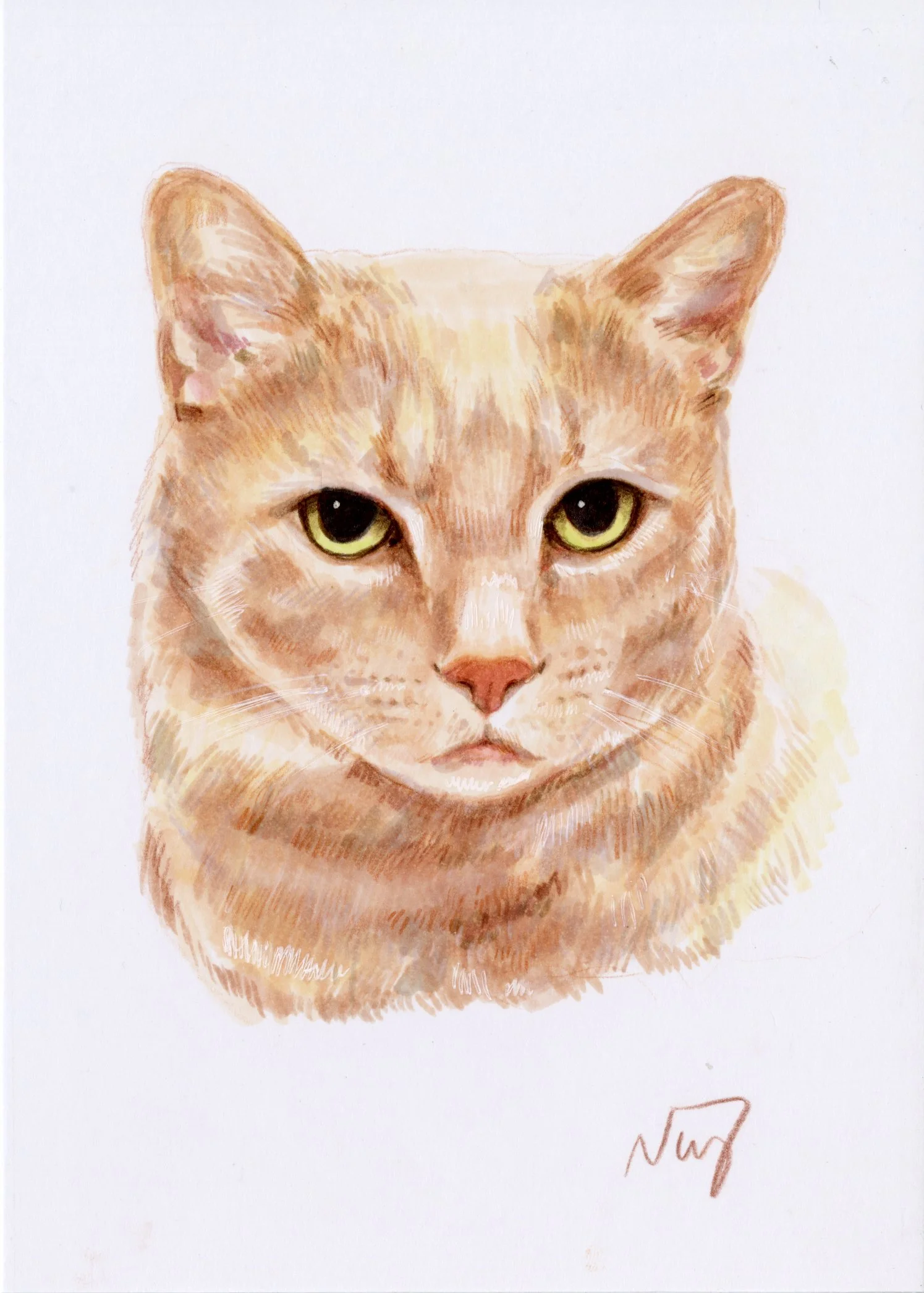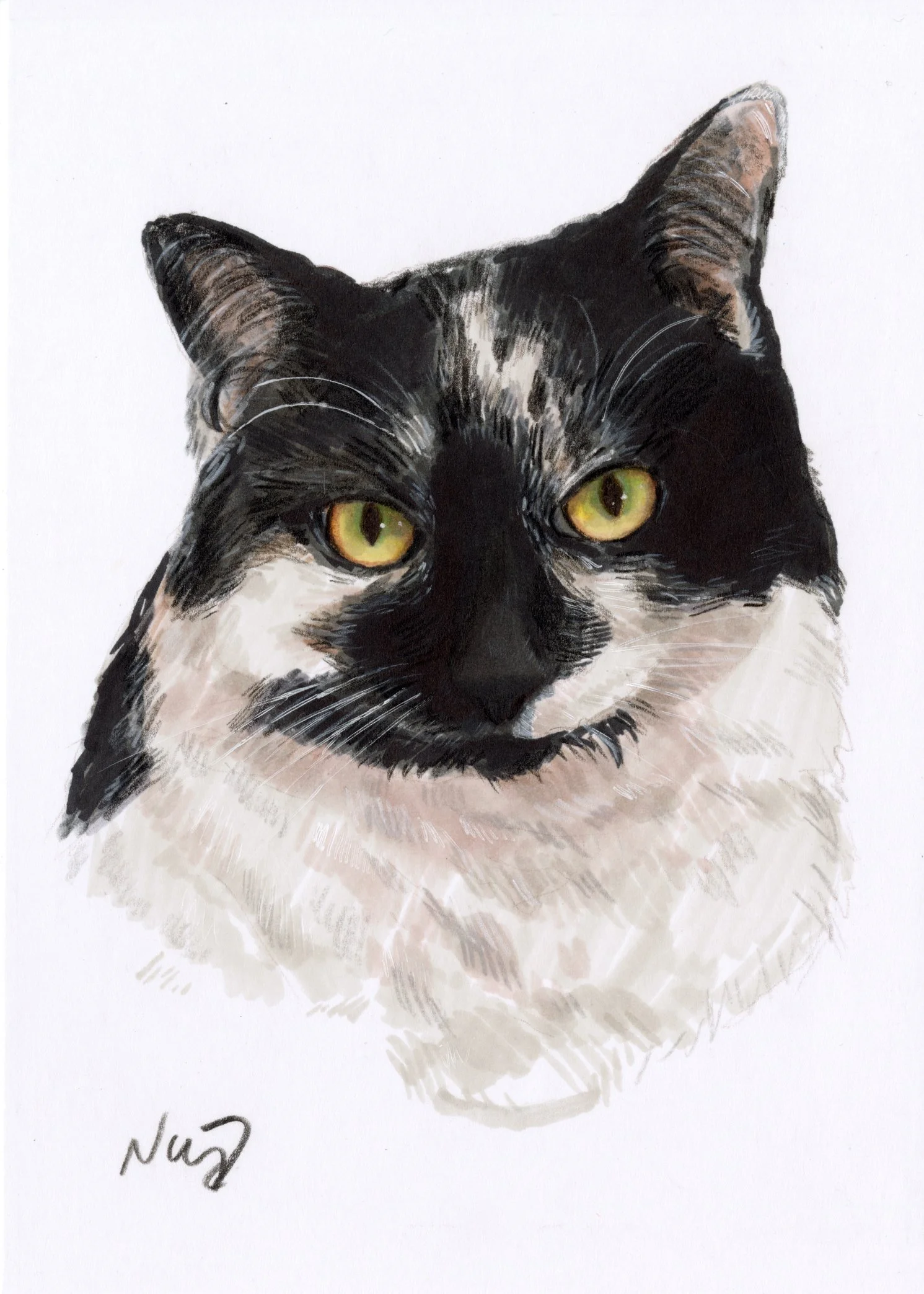 Nora’s popular commissions are 5 x 7 inch one of a kind portraits of animals or people using Prismacolor markers. They start at $100 and are drawn based off of a photograph provided. You can request a commission by contacting Nora directly through email.